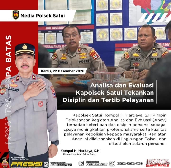 Melalui kegiatan Anev ini, Kapolsek Satui berharap seluruh personel dapat meningkatkan kesadaran akan pentingnya disiplin dan ketertiban sebagai landasan utama dalam memberikan pelayanan yang humanis, profesional, dan berintegritas kepada masyarat (her)