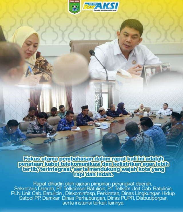Fokus utama pembahasan dalam rapat kali ini adalah penataan kabel telekomunikasi dan kelistrikan. Agar lebih tertib, terintegrasi, serta mendukung wajah kota yang rapi dan indah.