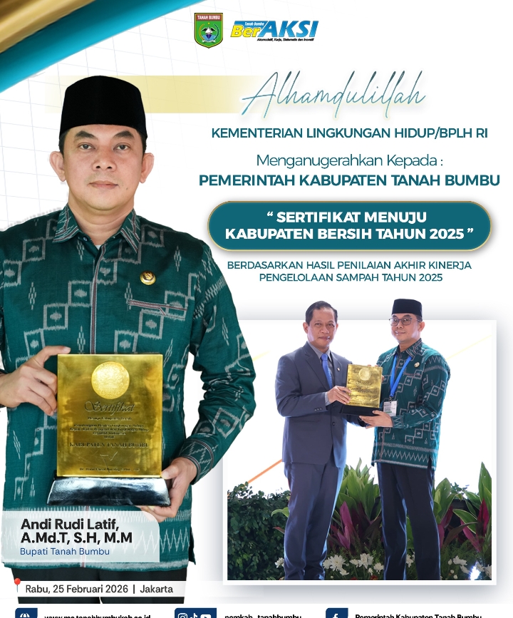 Bupati Tanah Bumbu, Andi Rudi Latif mengatakan Sertifikat Menuju Kabupaten Bersih Tahun 2025 ini merupakan buah dari kerja kolektif seluruh elemen masyarakat Tanah Bumbu yang berhasil menampilkan kinerja optimal dalam pengelolaan kebersihan serta pengendalian sampah melalui kolaborasi antara pemerintah, TNI, Polri, dunia usaha, pelajar dan masyarakat.