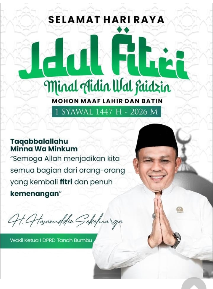 Dalam suasana penuh khidmat menyambut 1 Syawal 1447 Hijriah atau bertepatan dengan tahun 2026 Masehi, H. Hasanuddin bersama keluarga besar menyampaikan ucapan selamat Hari Raya Idul Fitri kepada seluruh masyarakat Tanah Bumbu.